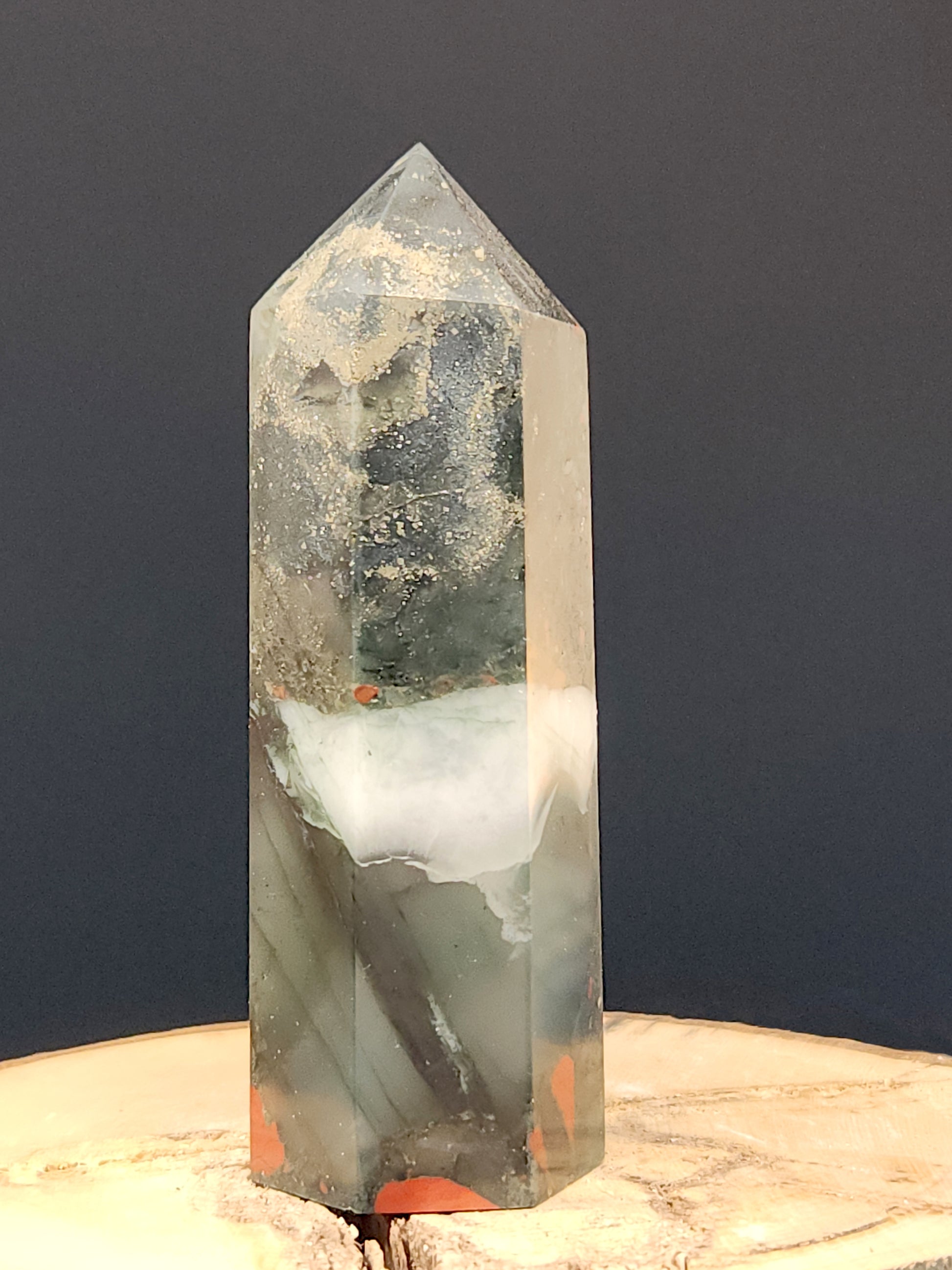 This African bloodstone tower speaks of individuality. A brash white inclusion takes center stage on a deep chalcedony background, while the red jasper and sparkly spots remain somewhat subtle and subdued. Very interesting piece to spend time looking at.