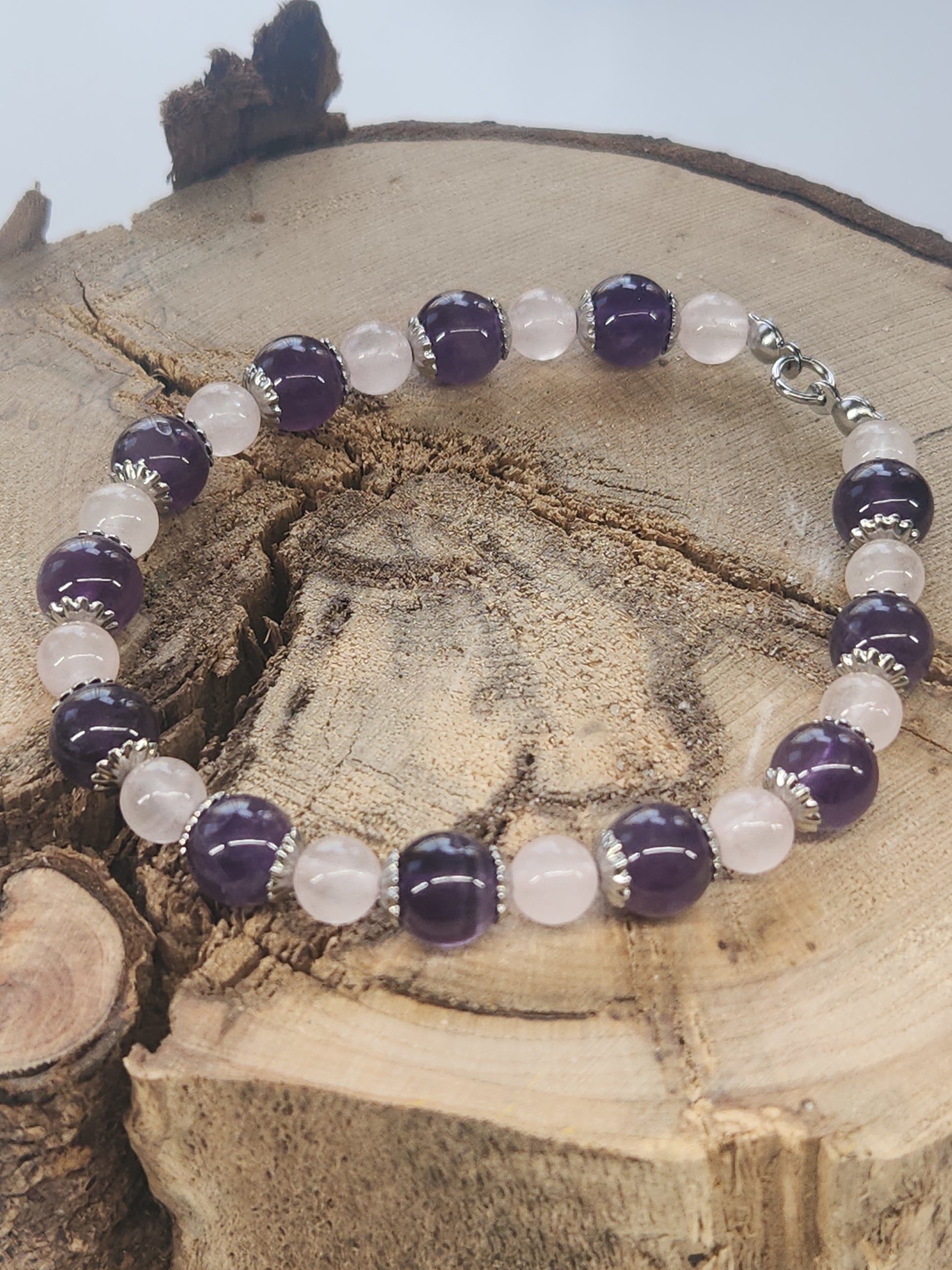 Amethyst has been attributed with prosperity, serenity, and sweet dreams. It helps us discard old, negative influences and habits. Rose quartz is a stone known for unconditional love, compassion, forgiveness, and self-love. Together they may bring a new calm, love, and self acceptance.