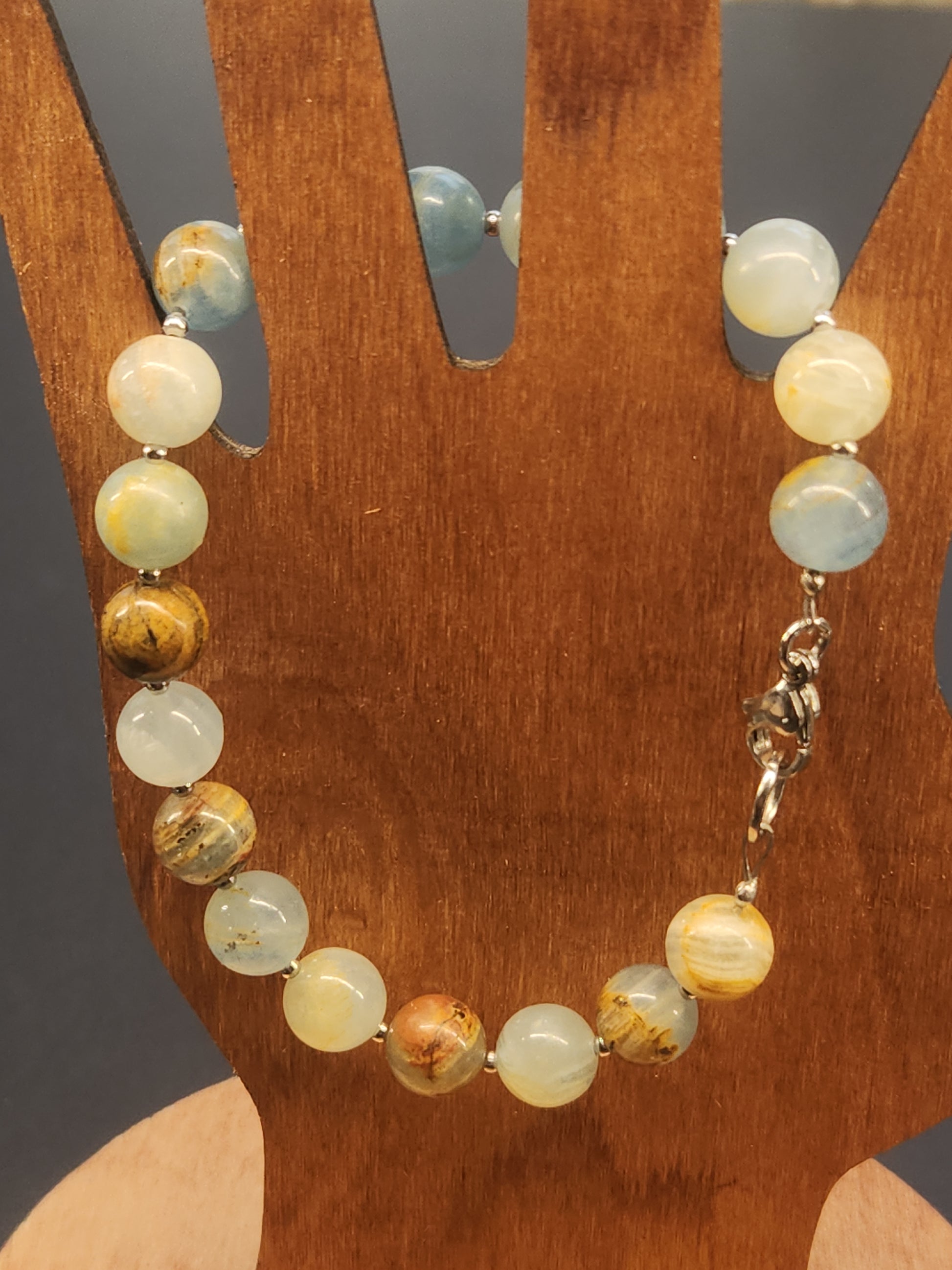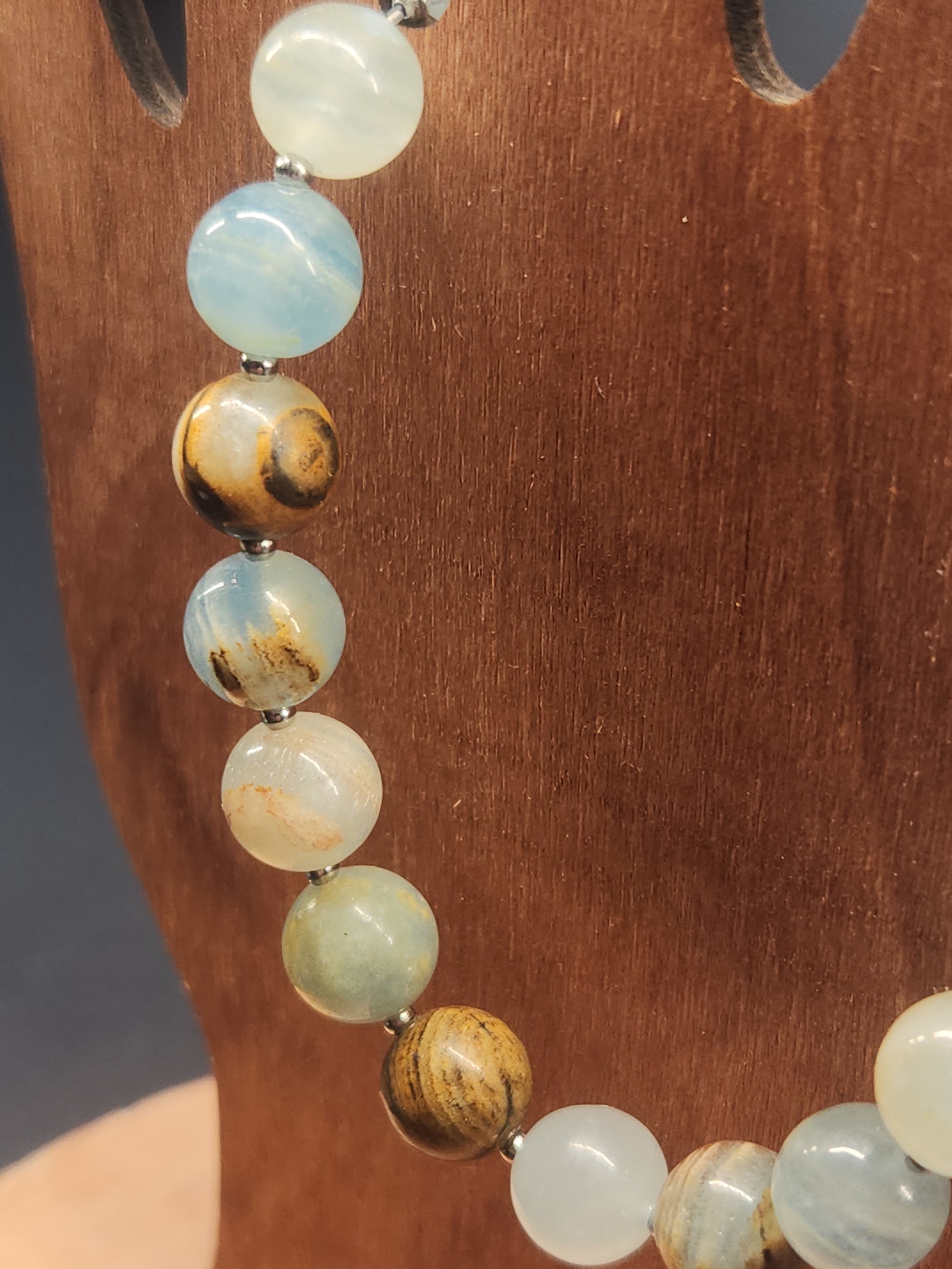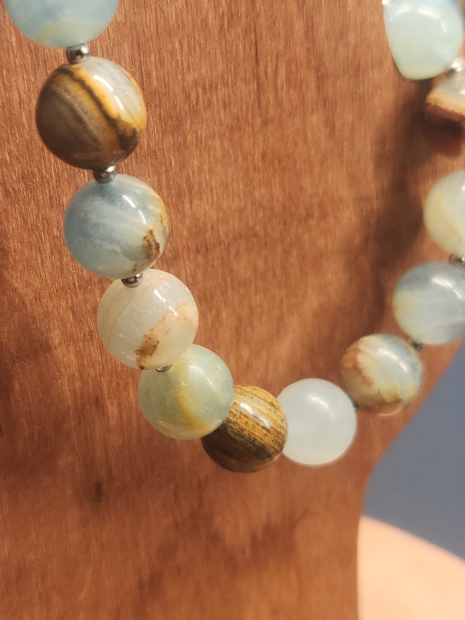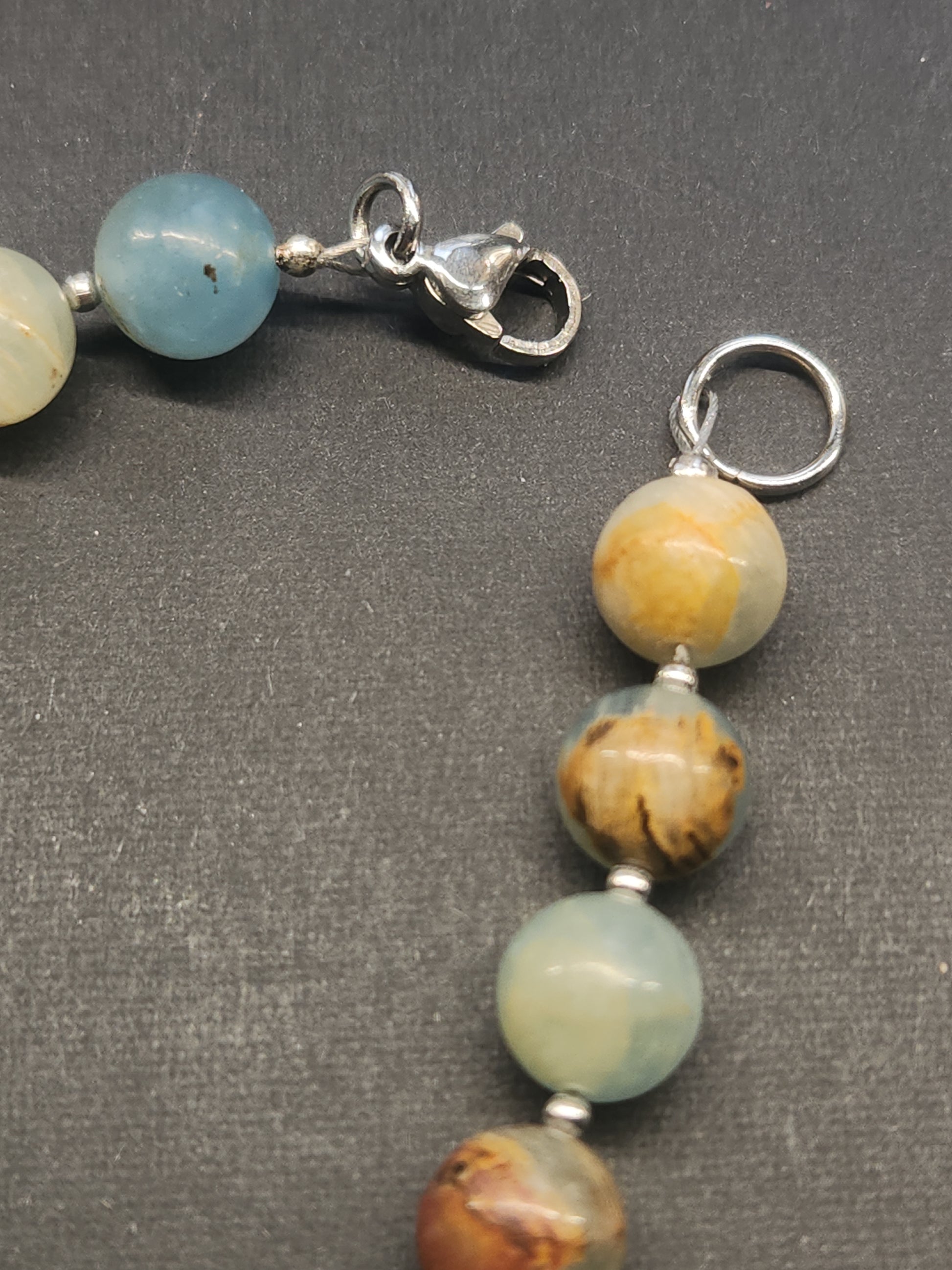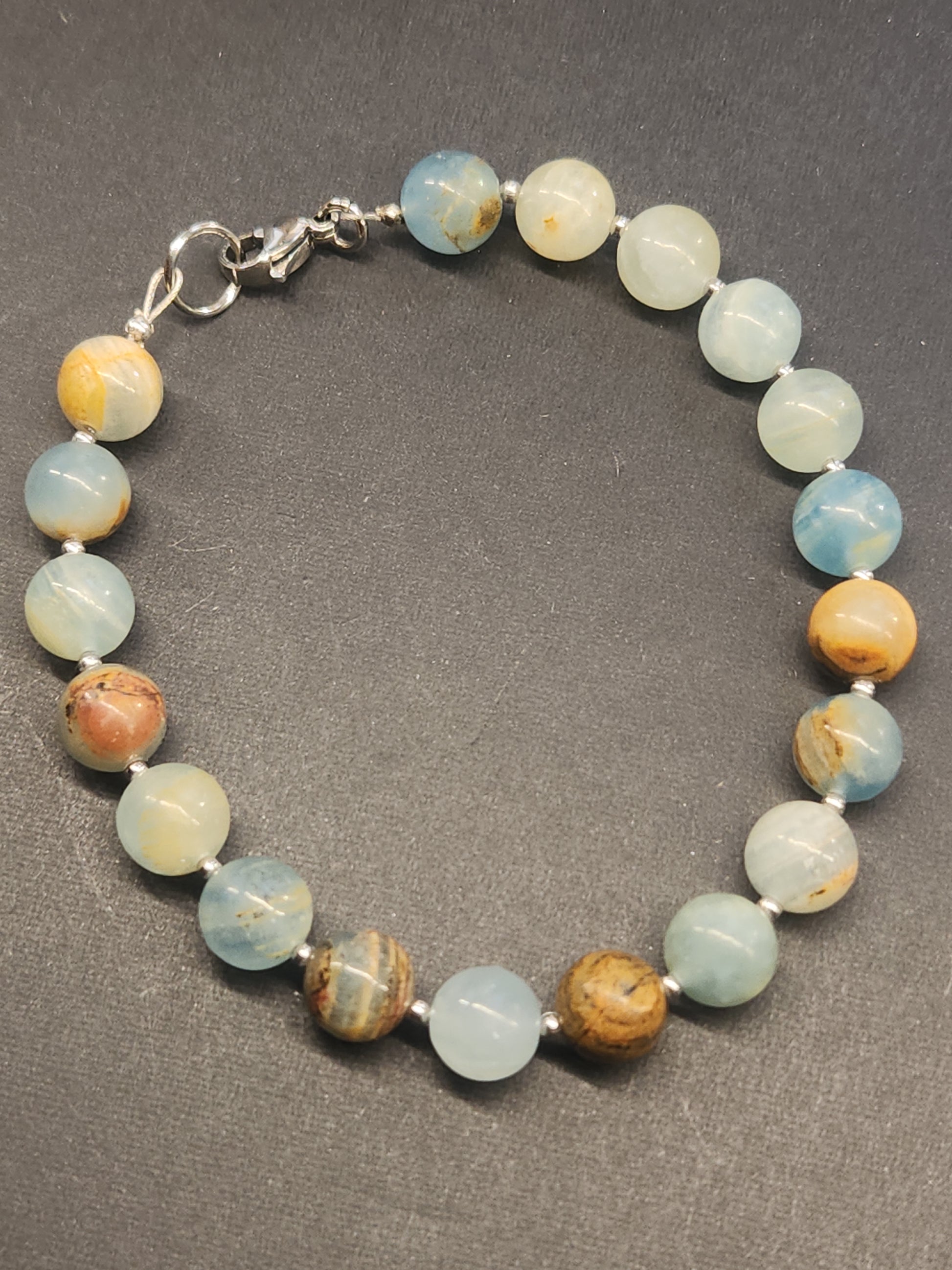 A beautiful and sturdy bracelet featuring 8mm beads strung on a stainless steel cable. The lobster clasp and accent beads are all durable stainless steel as well. The blue onyx beads display a striking variety of blue, brown, and white bands and swirls.