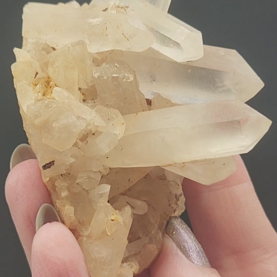 A pretty, pointy clear quartz cluster. Slightly reminiscent of crystal spires floating on a cloud city.