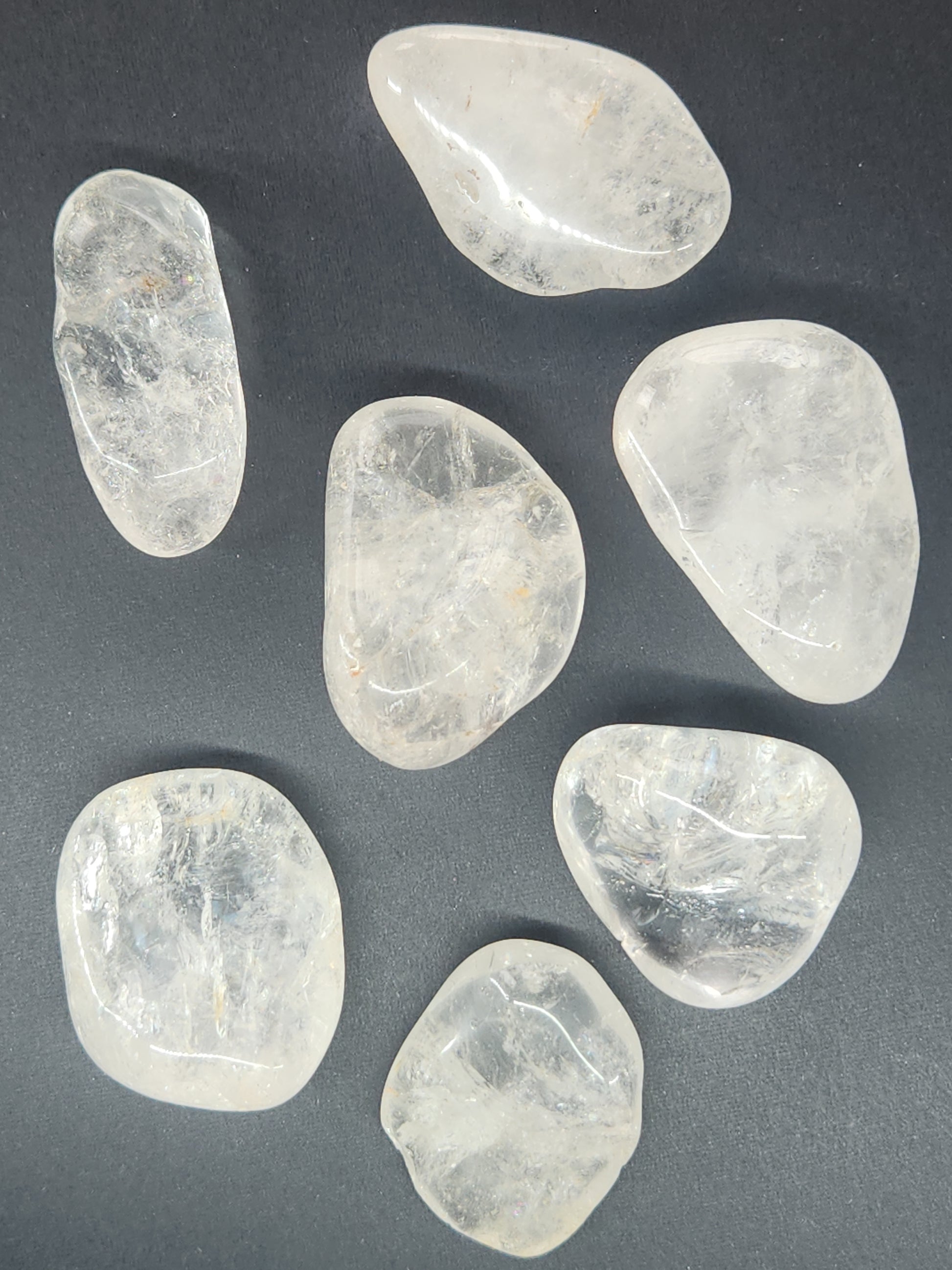 Big chunky clear quartz tumbles with lots of cloudy bits and rainbow veils to look at.